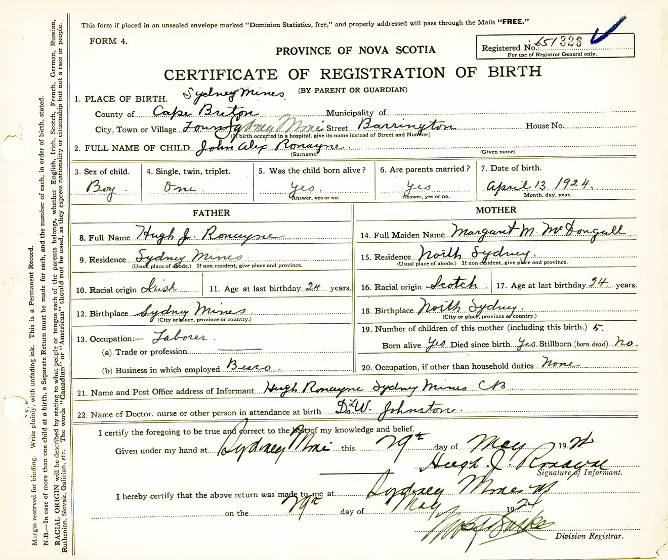 Male Birth Registration: Year: 1924 number: 65100326