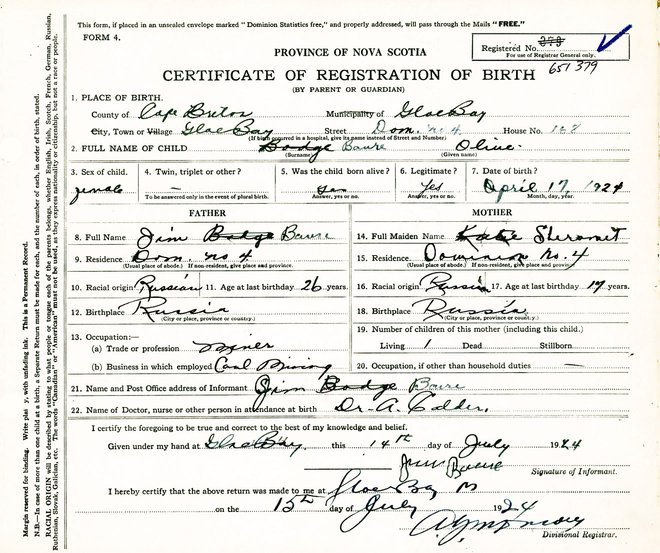 Female Birth Registration: Year: 1924 number: 65100379