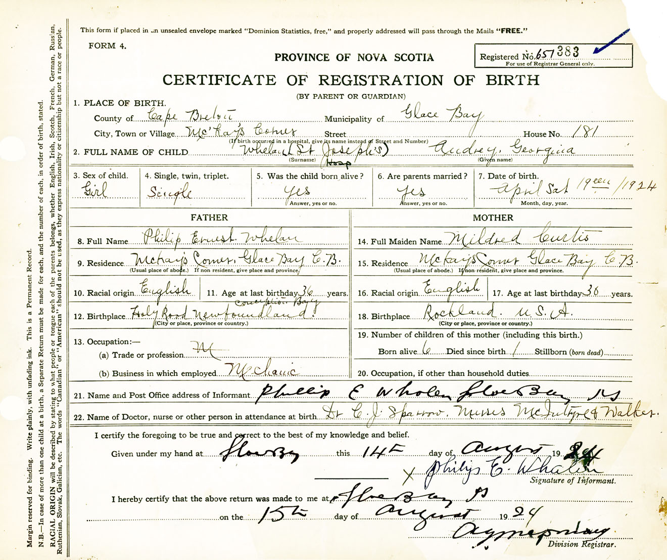 Female Birth Registration: Year: 1924 number: 65100383