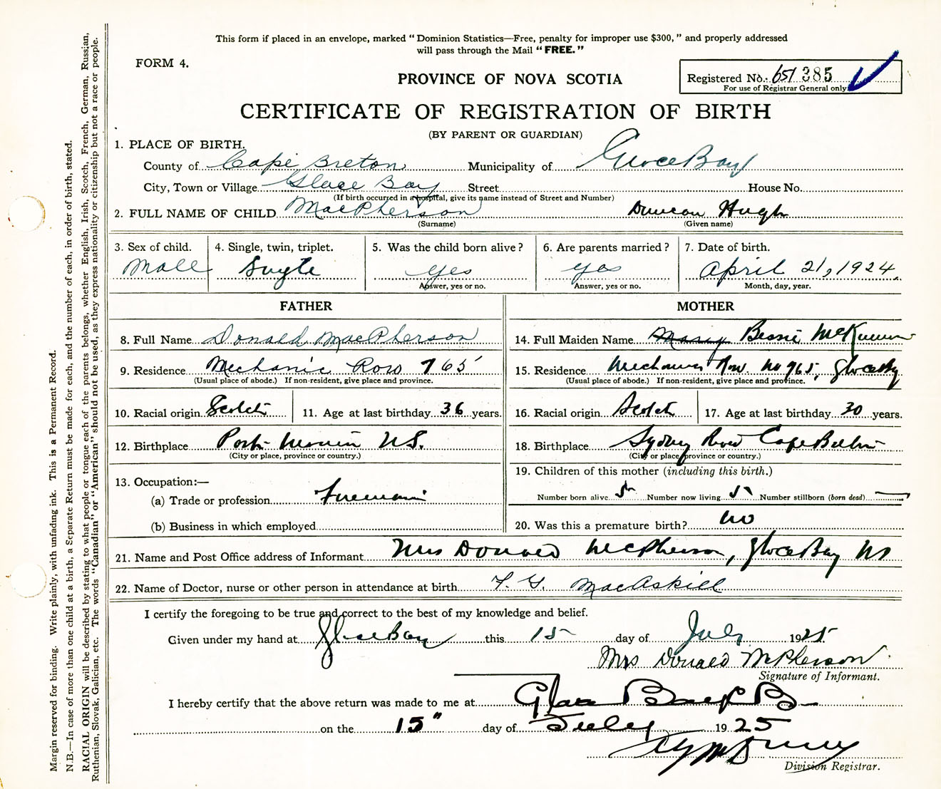 Male Birth Registration: Year: 1924 number: 65100385