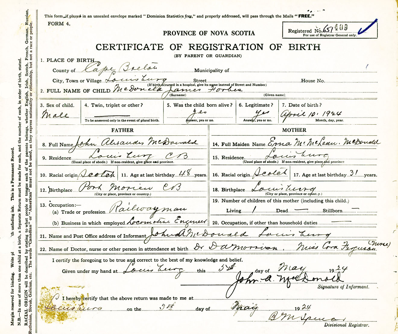 Male Birth Registration: Year: 1924 number: 65100409