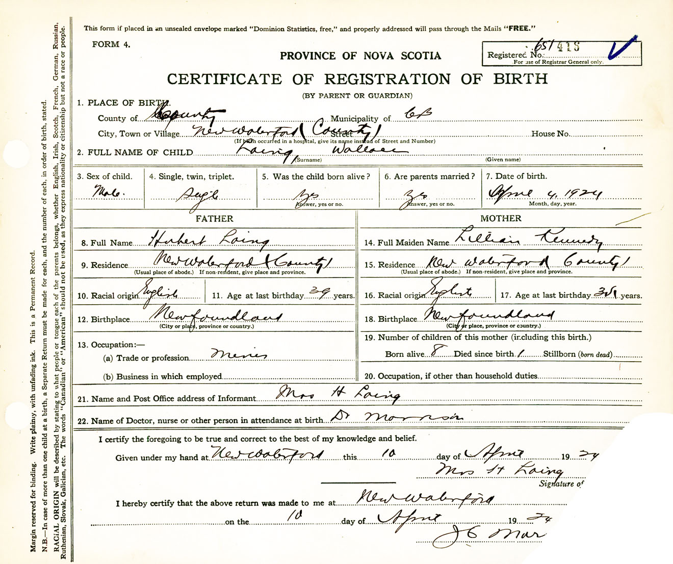 Male Birth Registration: Year: 1924 number: 65100416