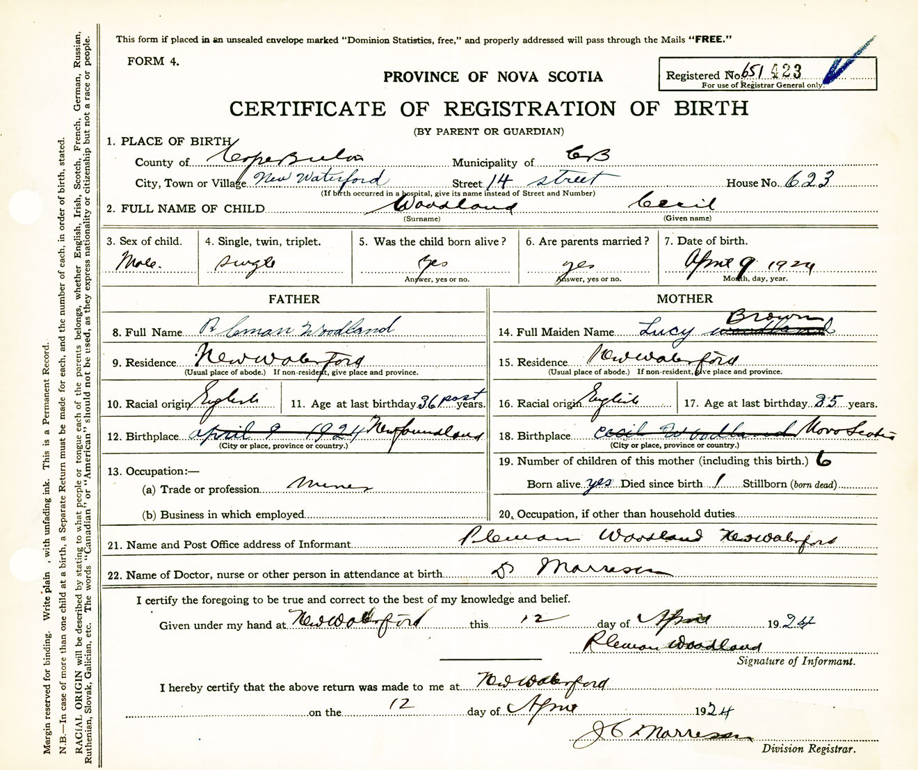 Male Birth Registration: Year: 1924 number: 65100423