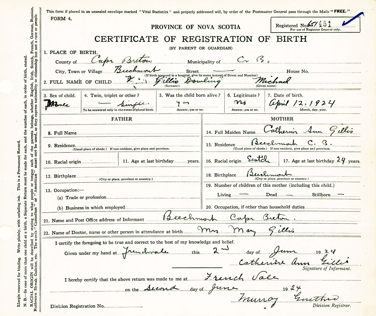 Male Birth Registration: Year: 1924 number: 65100451