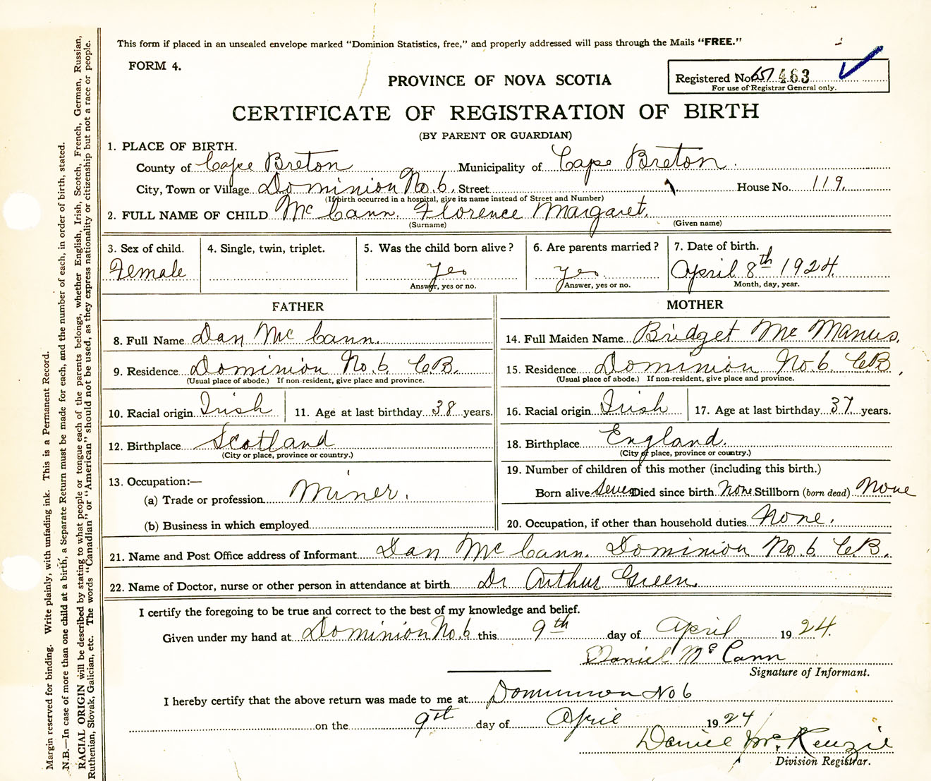 Female Birth Registration: Year: 1924 number: 65100463