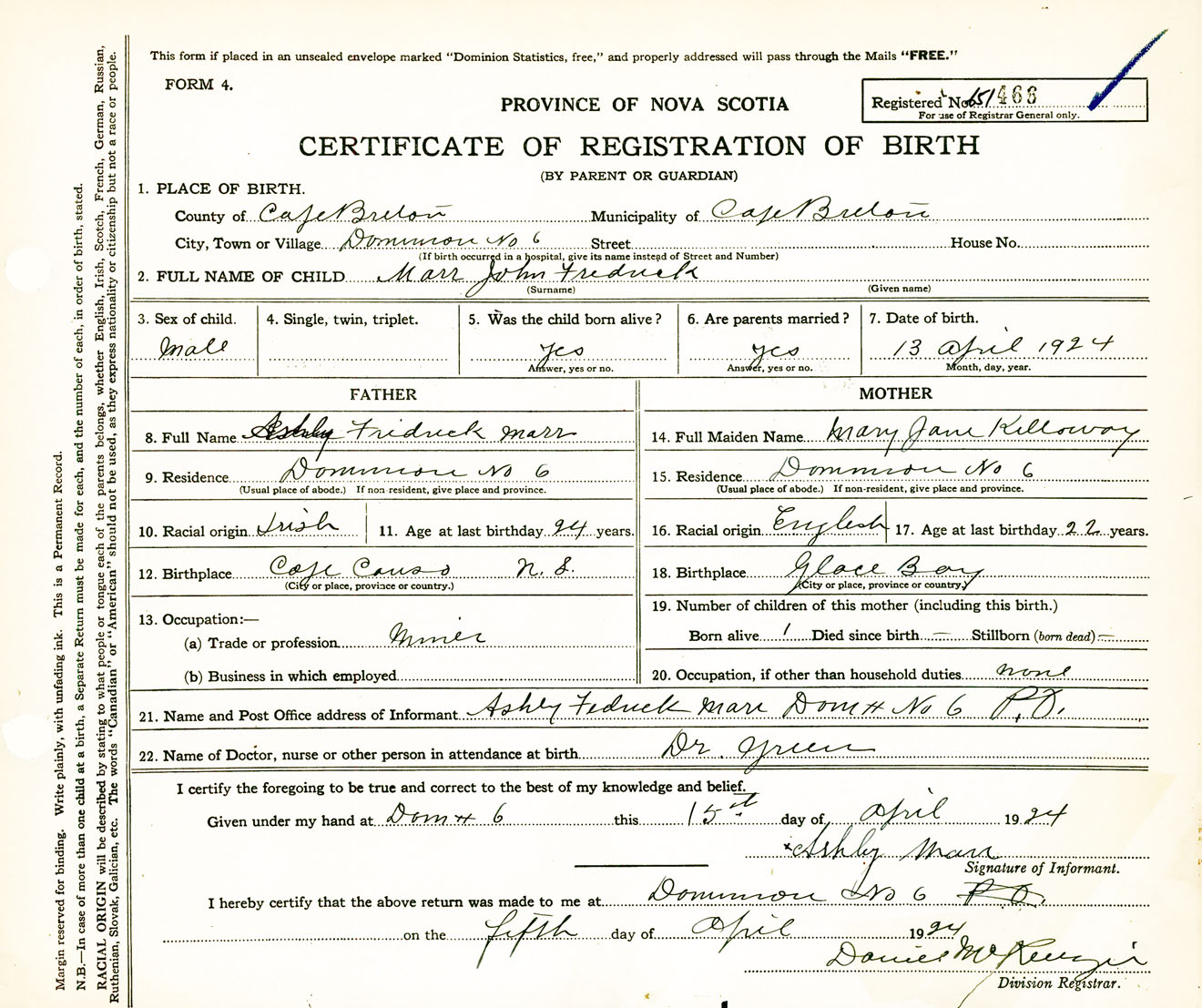 Male Birth Registration: Year: 1924 number: 65100466