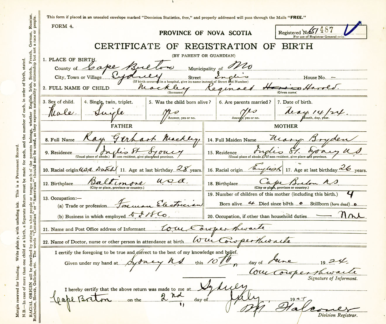 Male Birth Registration: Year: 1924 number: 65100487