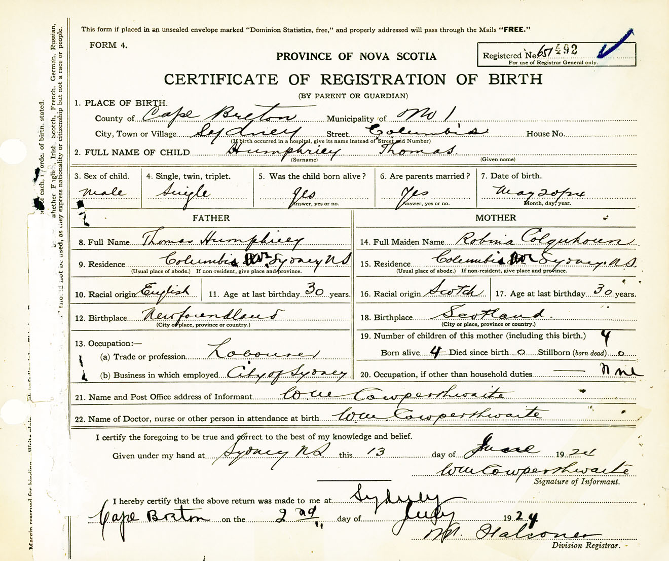 Male Birth Registration: Year: 1924 number: 65100492