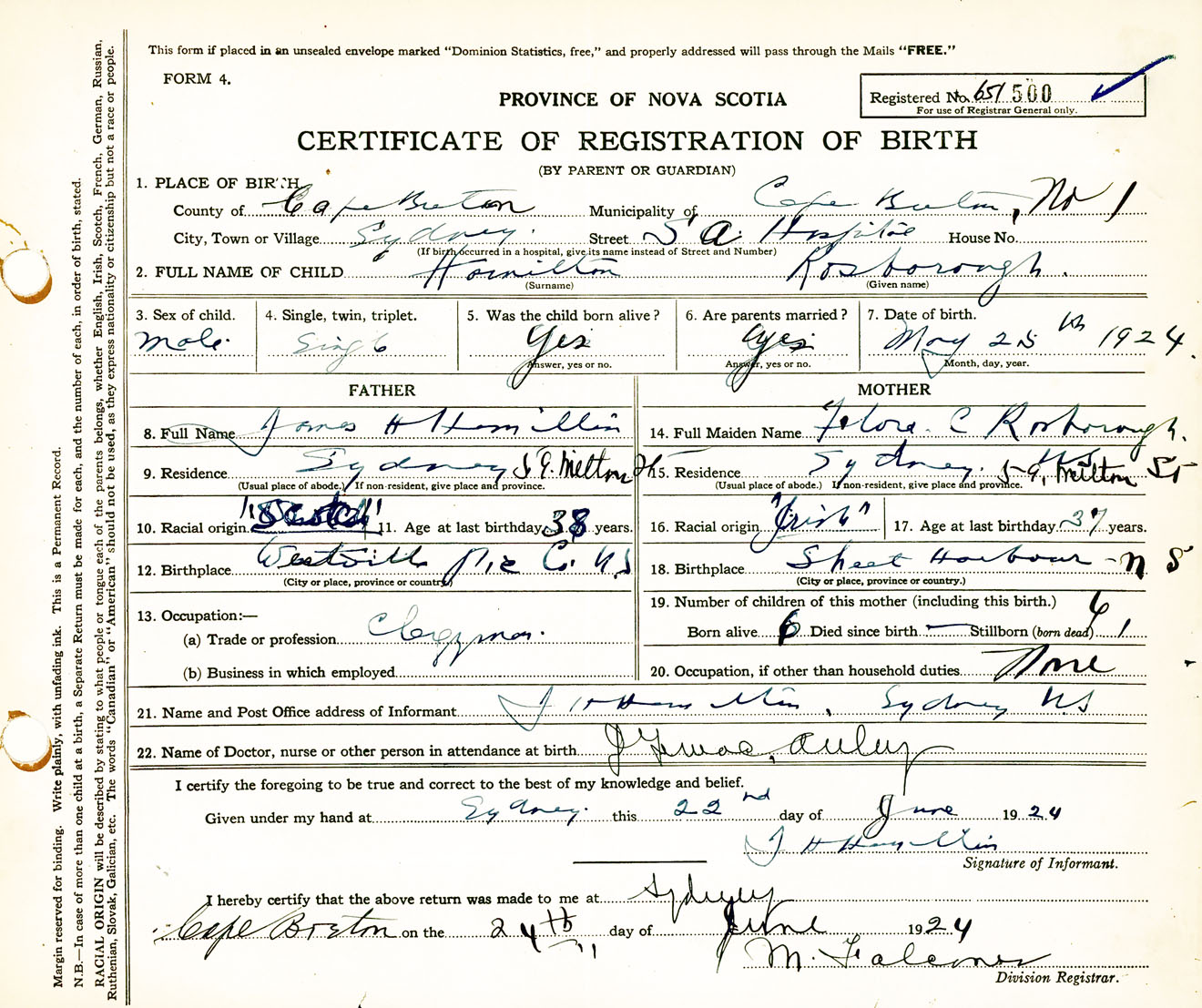 Male Birth Registration: Year: 1924 number: 65100500