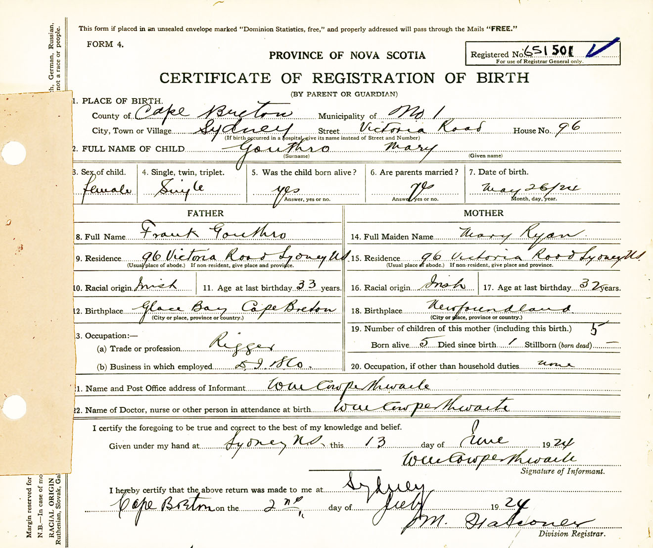 Female Birth Registration: Year: 1924 number: 65100501