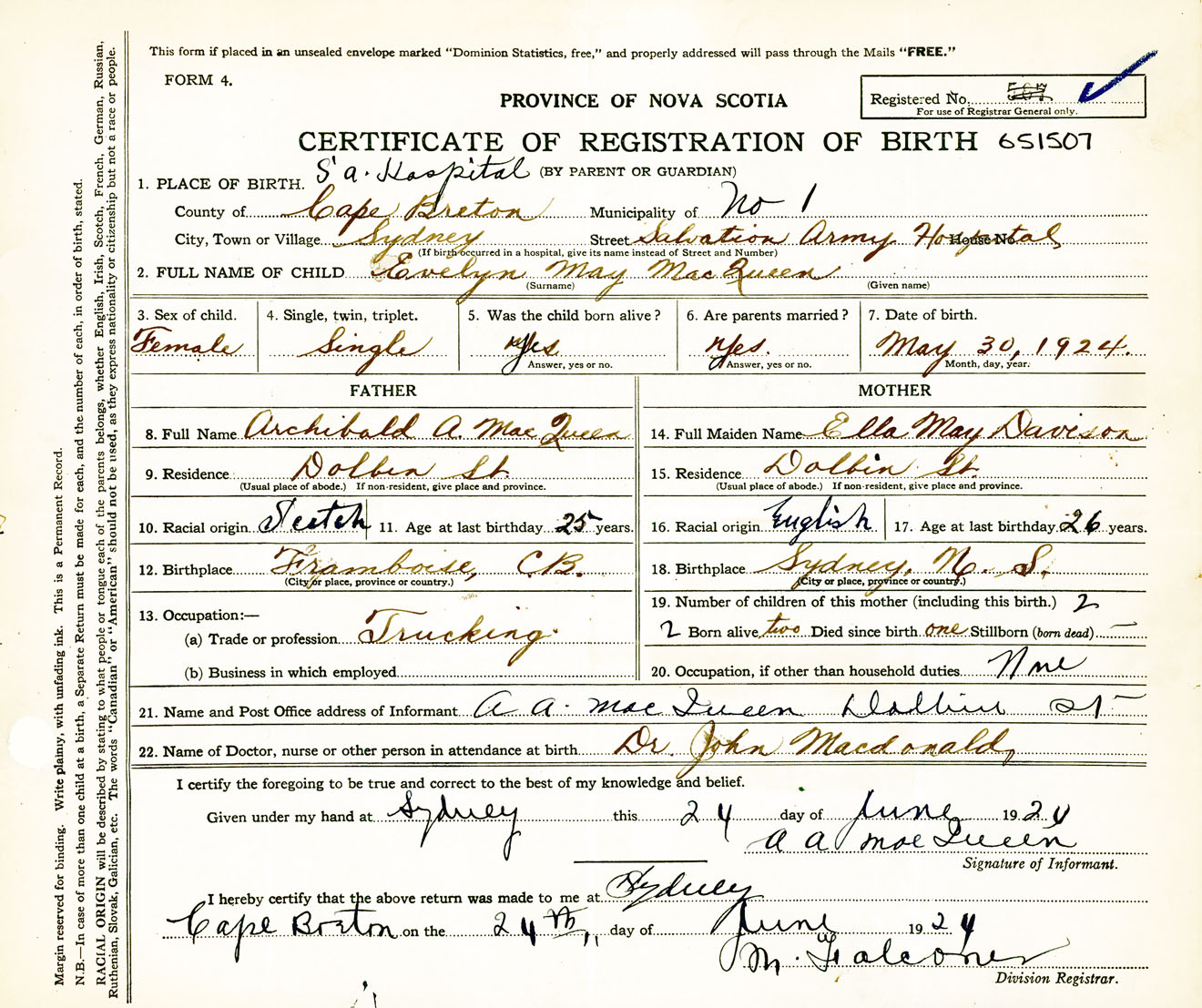 Female Birth Registration: Year: 1924 number: 65100507