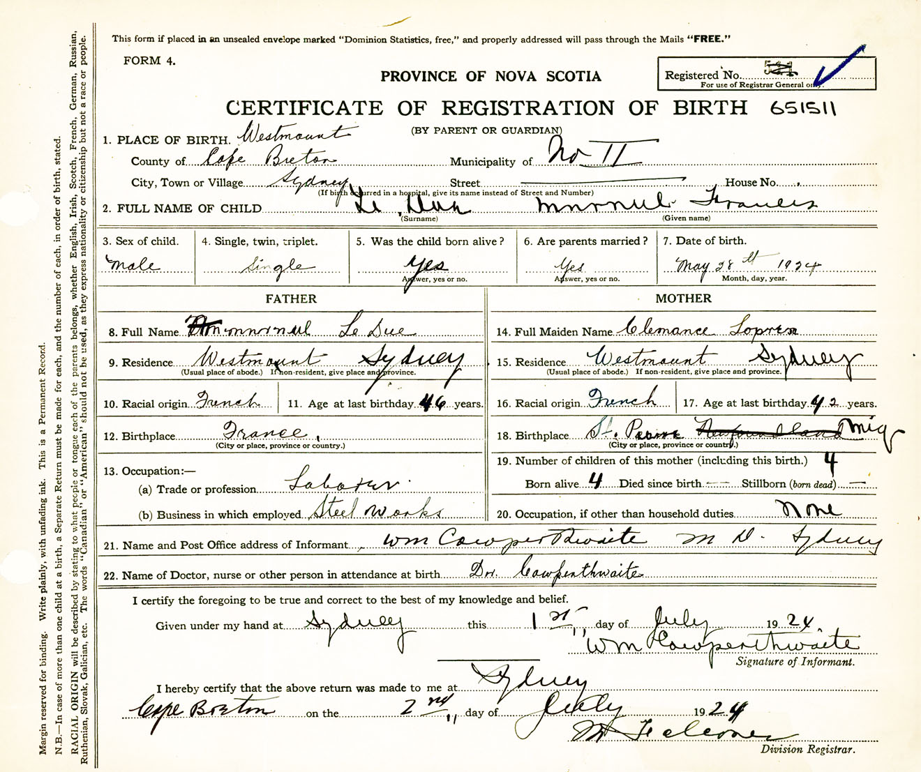 Male Birth Registration: Year: 1924 number: 65100511