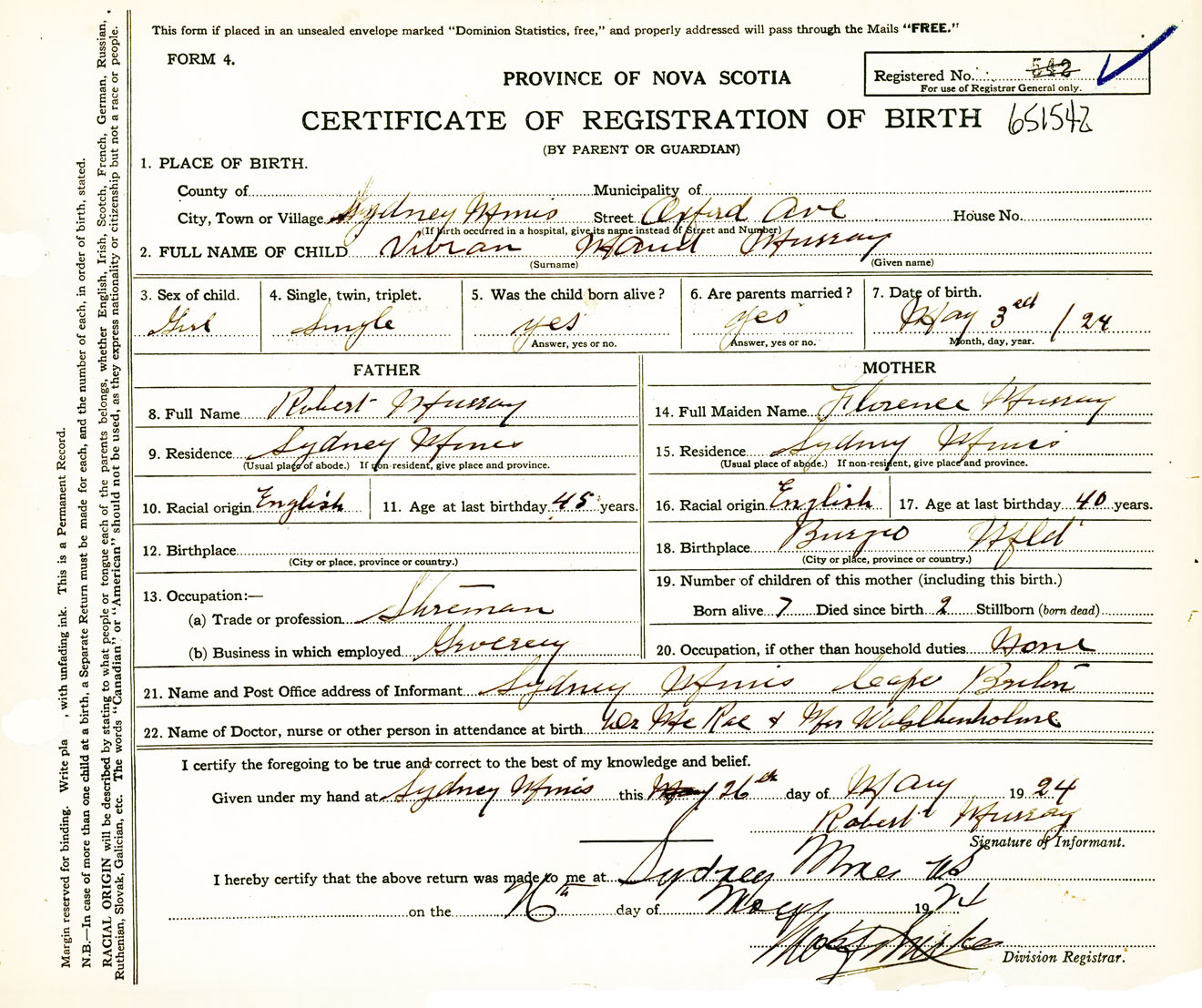 Female Birth Registration: Year: 1924 number: 65100542
