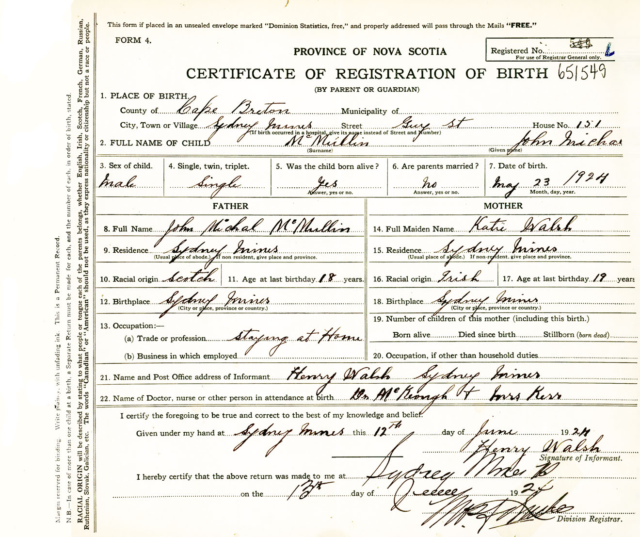 Male Birth Registration: Year: 1924 number: 65100549