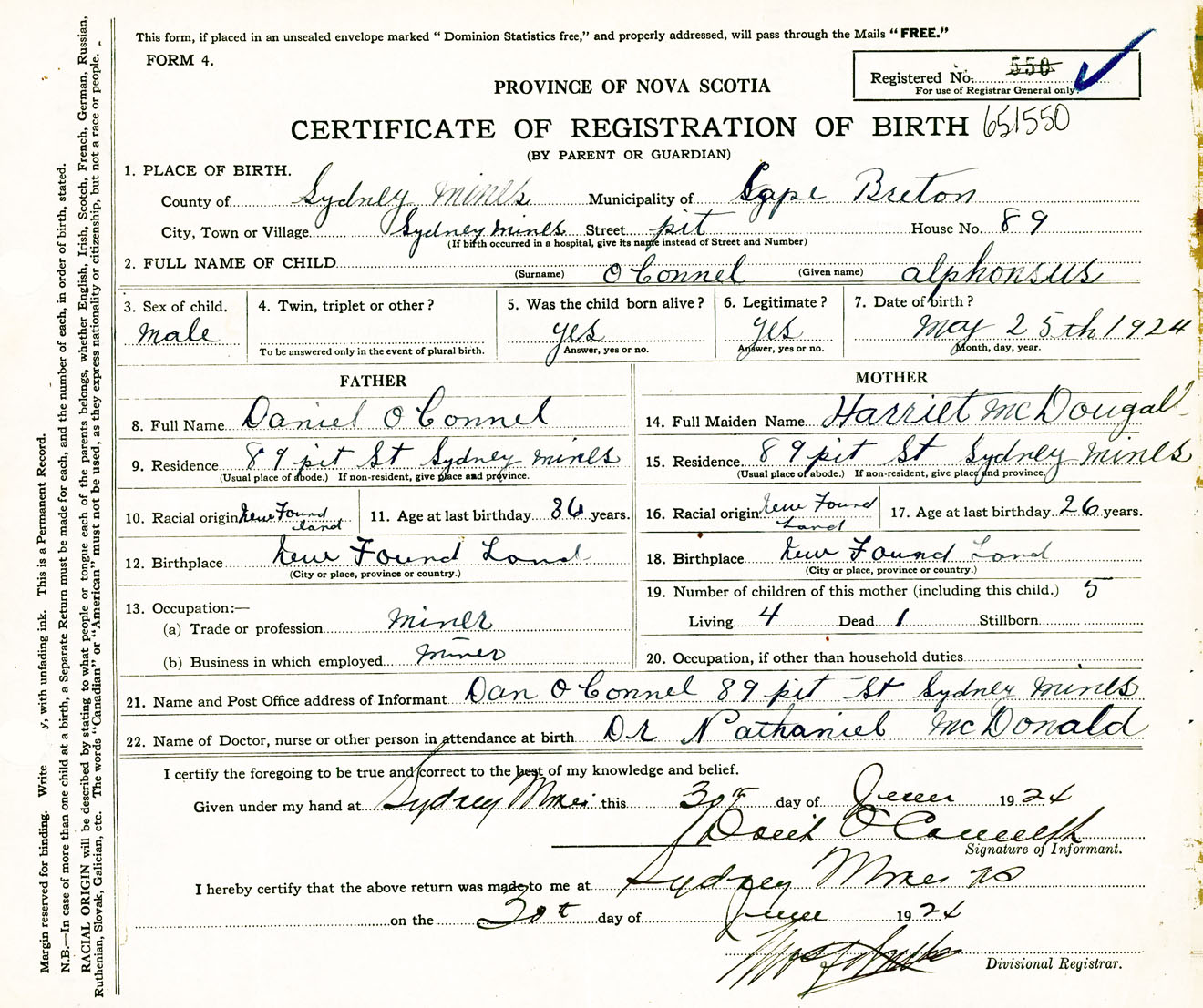 Male Birth Registration: Year: 1924 number: 65100550