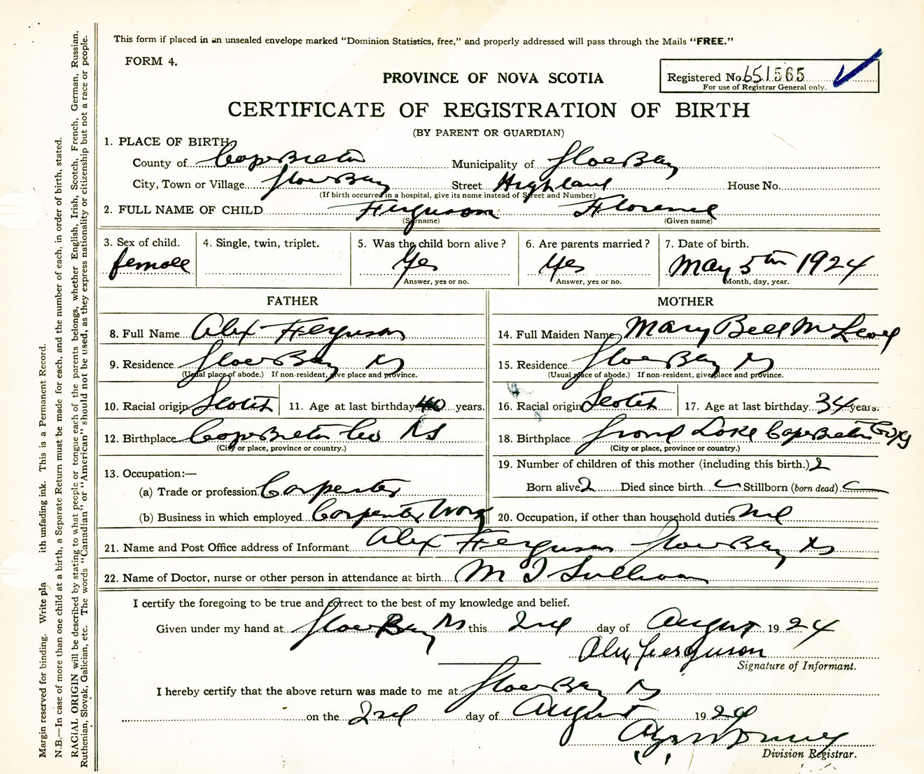 Female Birth Registration: Year: 1924 number: 65100565