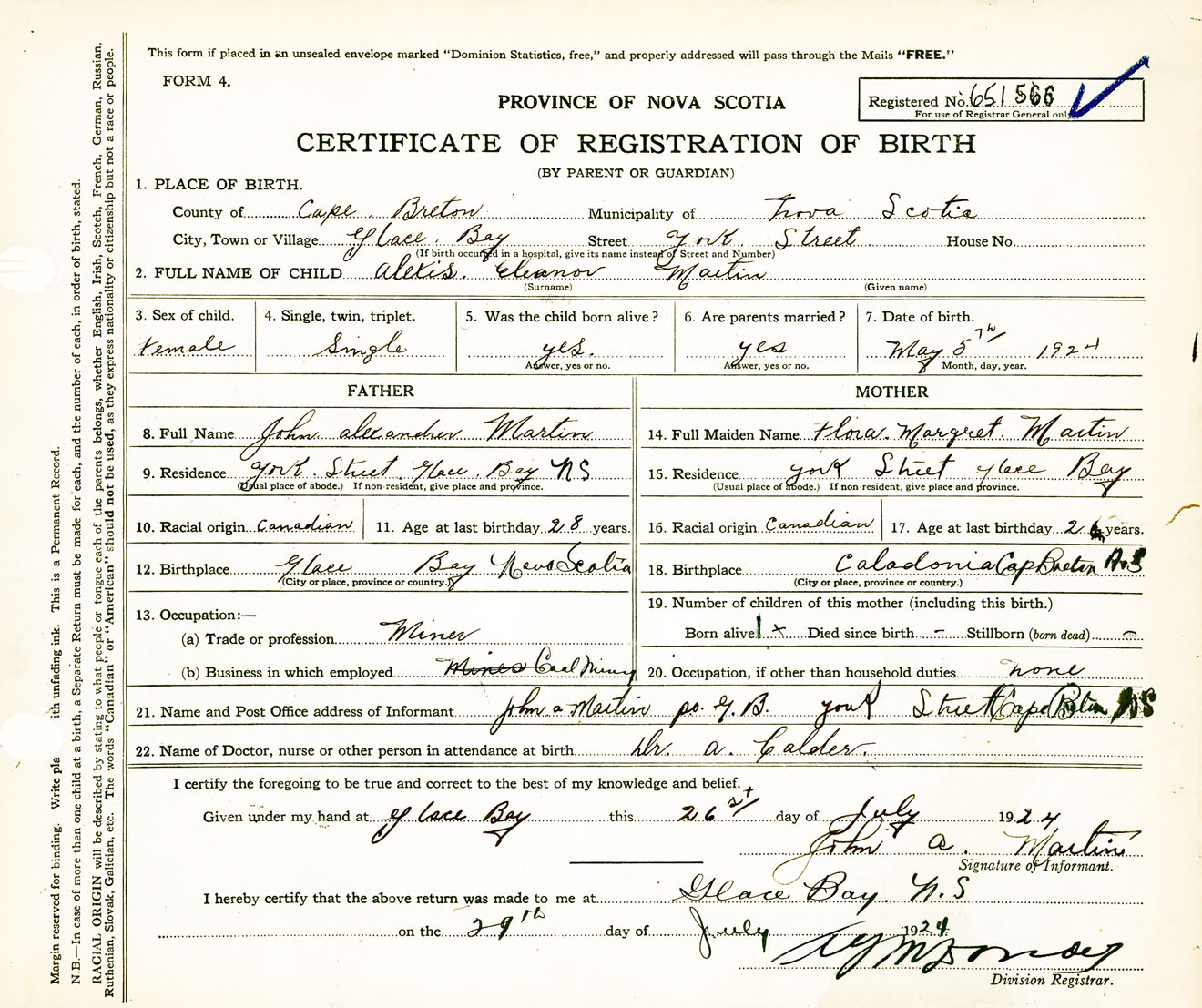 Female Birth Registration: Year: 1924 number: 65100566