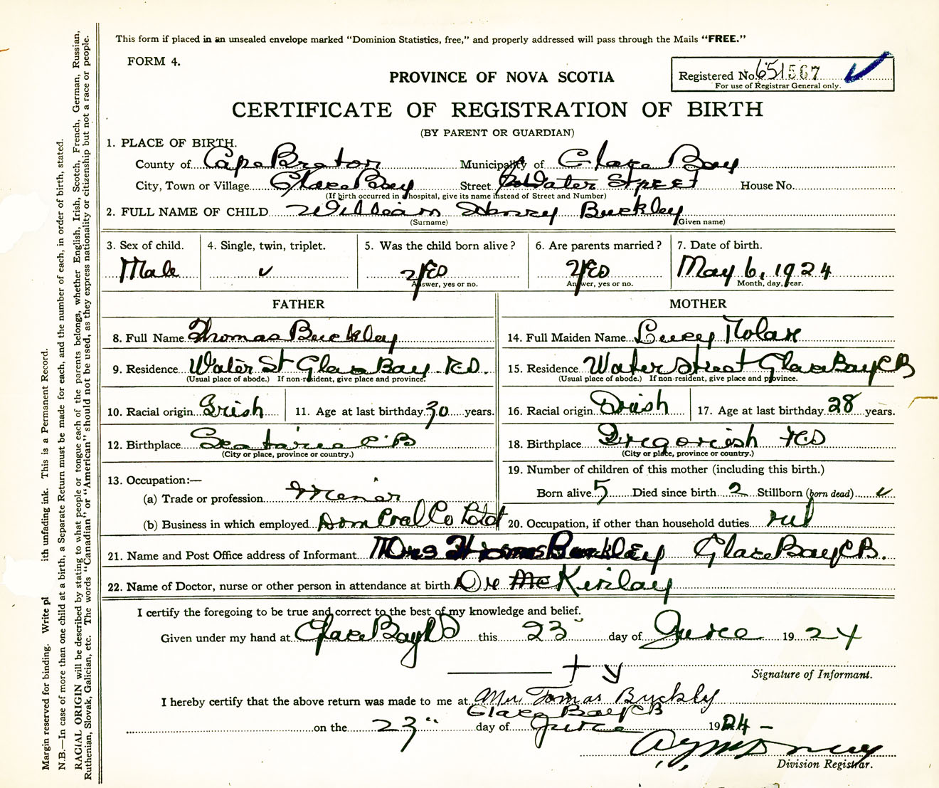 Male Birth Registration: Year: 1924 number: 65100567