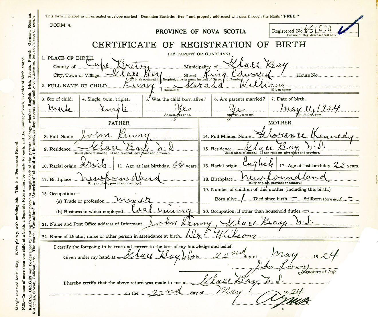 Male Birth Registration: Year: 1924 number: 65100579