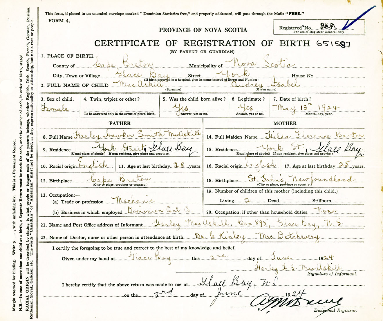 Female Birth Registration: Year: 1924 number: 65100587