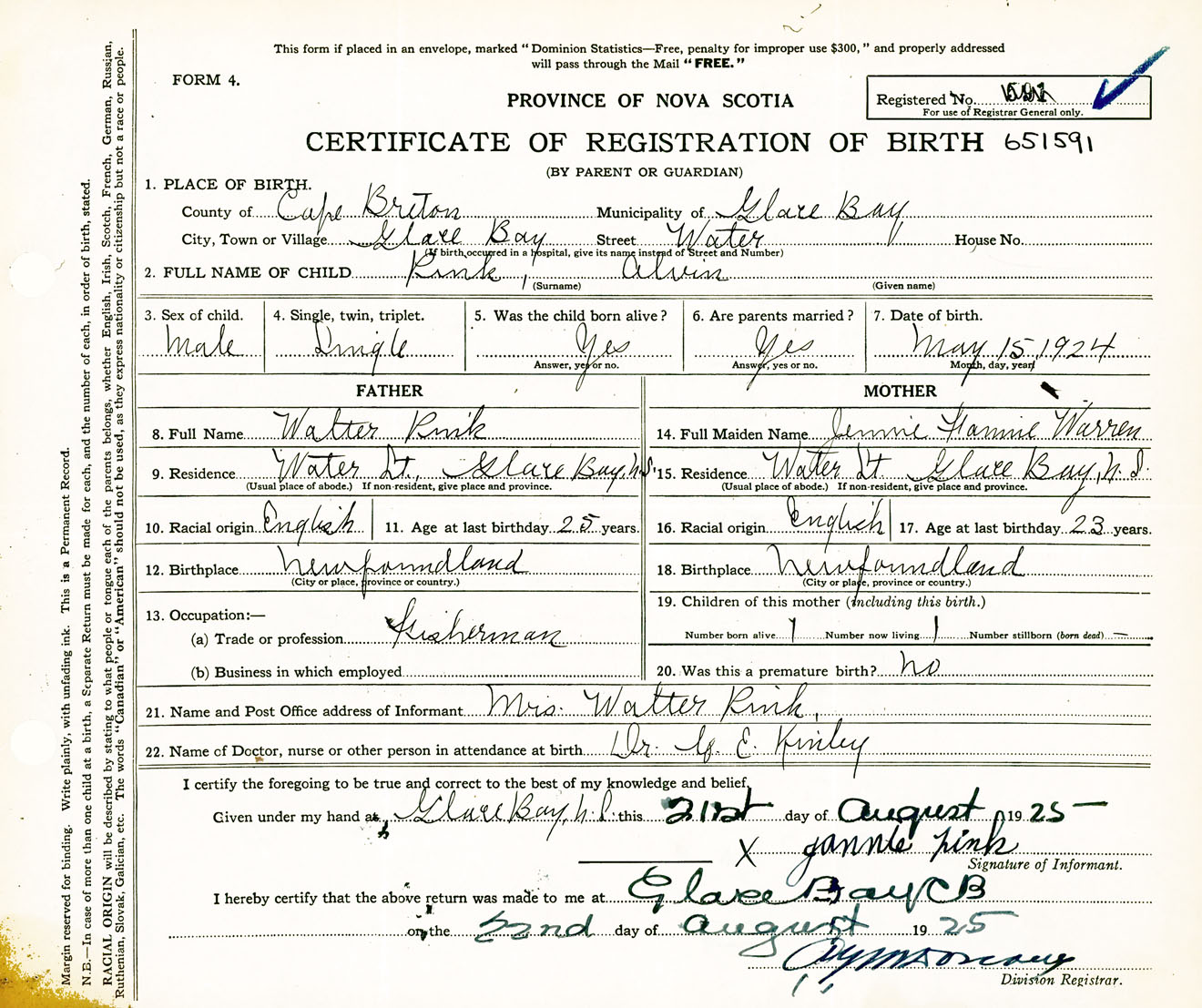 Male Birth Registration: Year: 1924 number: 65100591