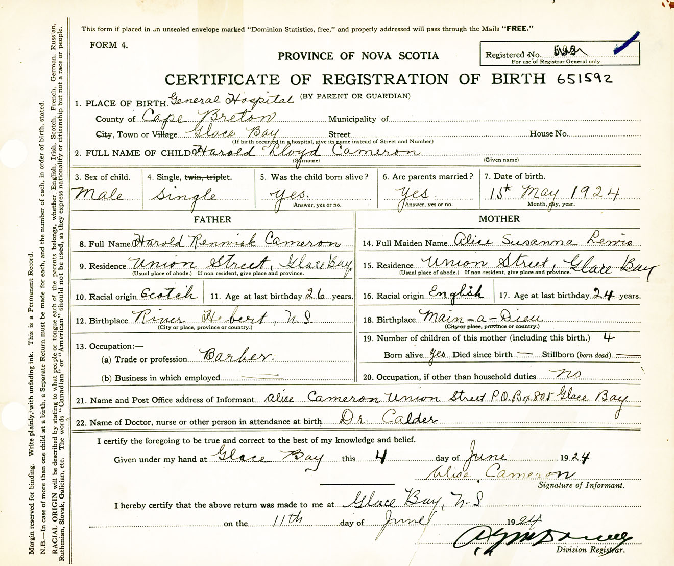 Male Birth Registration: Year: 1924 number: 65100592