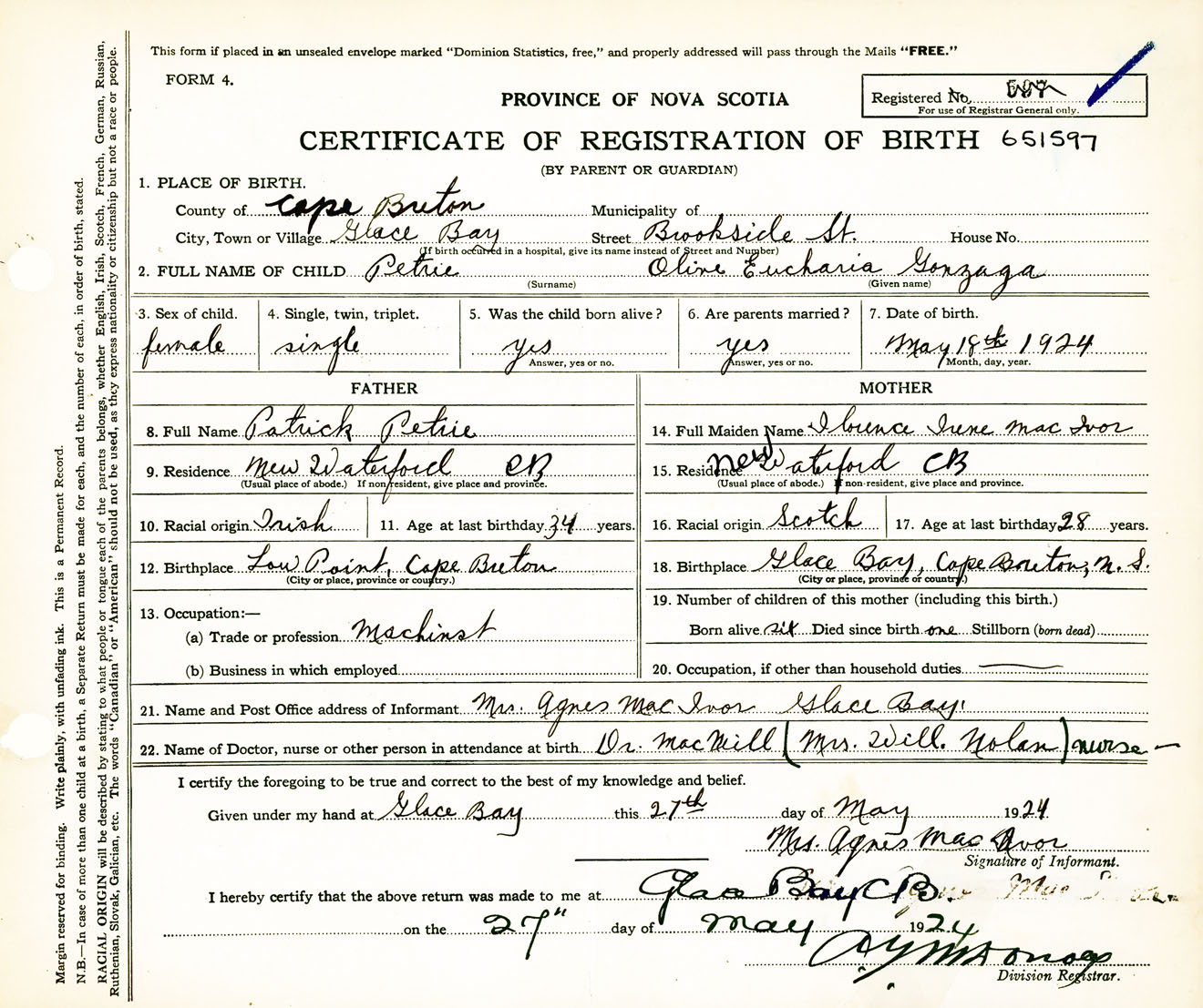 Female Birth Registration: Year: 1924 number: 65100597