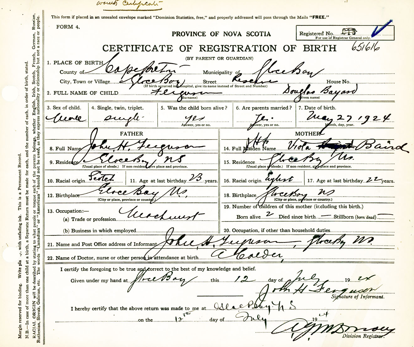 Male Birth Registration: Year: 1924 number: 65100616