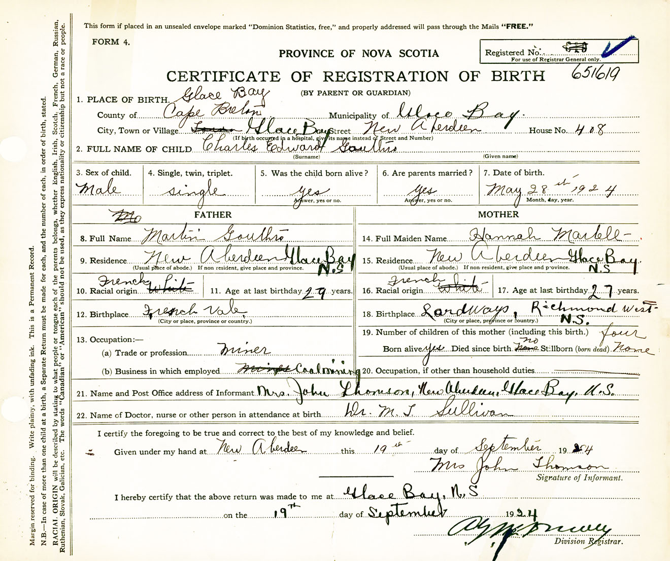Male Birth Registration: Year: 1924 number: 65100619