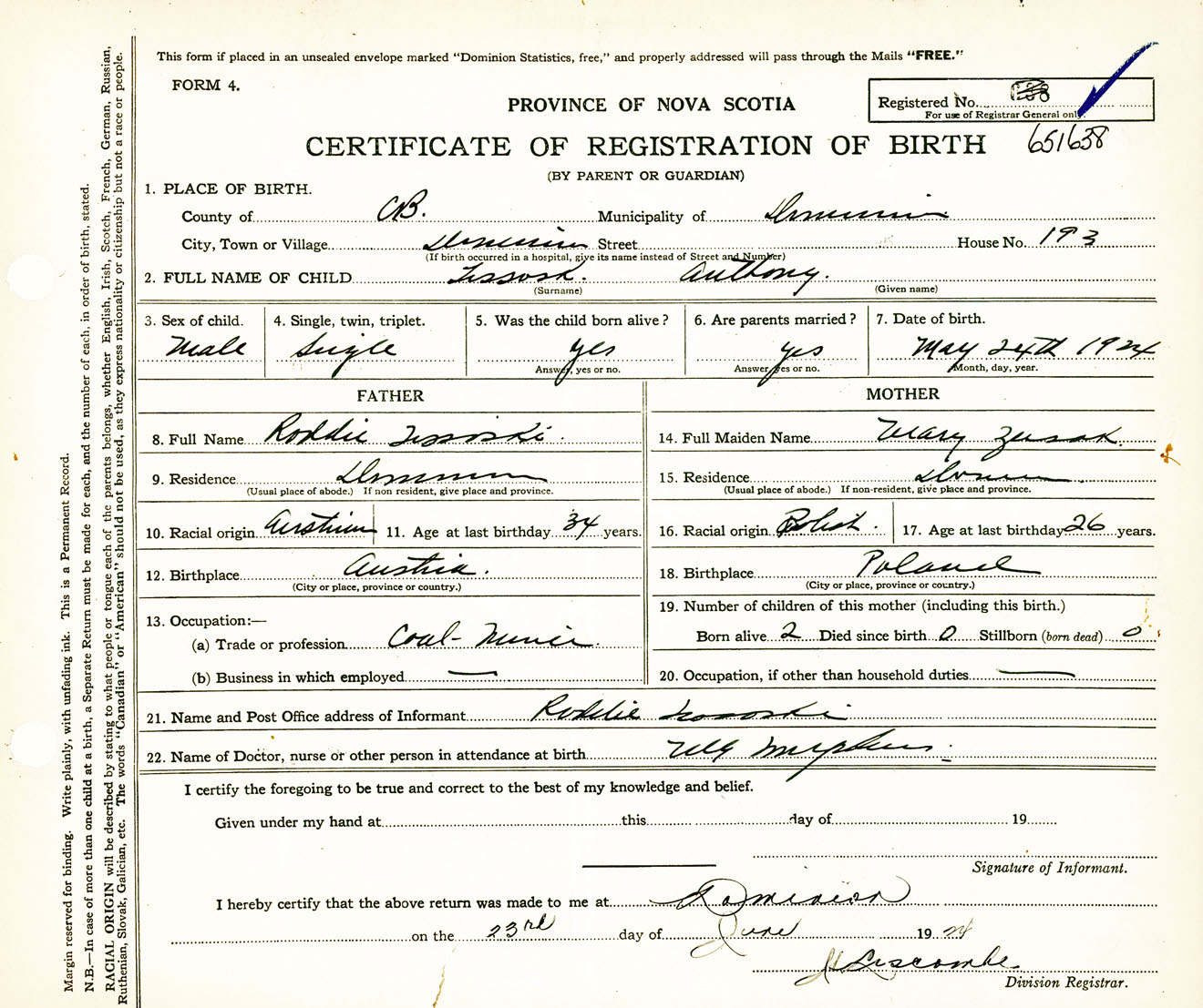 Male Birth Registration: Year: 1924 number: 65100638