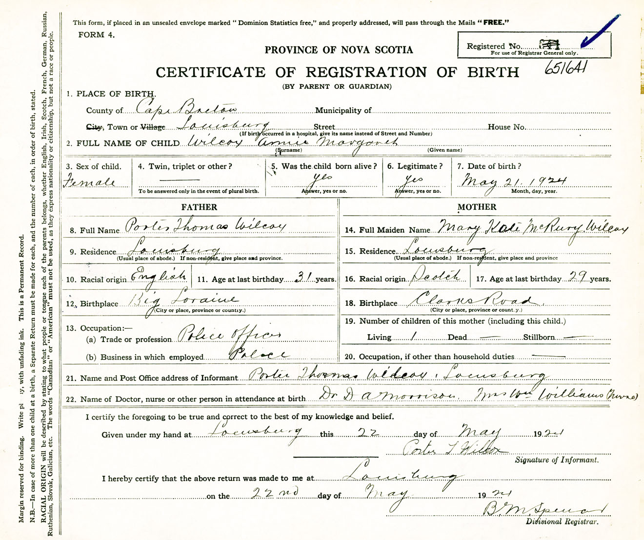Female Birth Registration: Year: 1924 number: 65100641