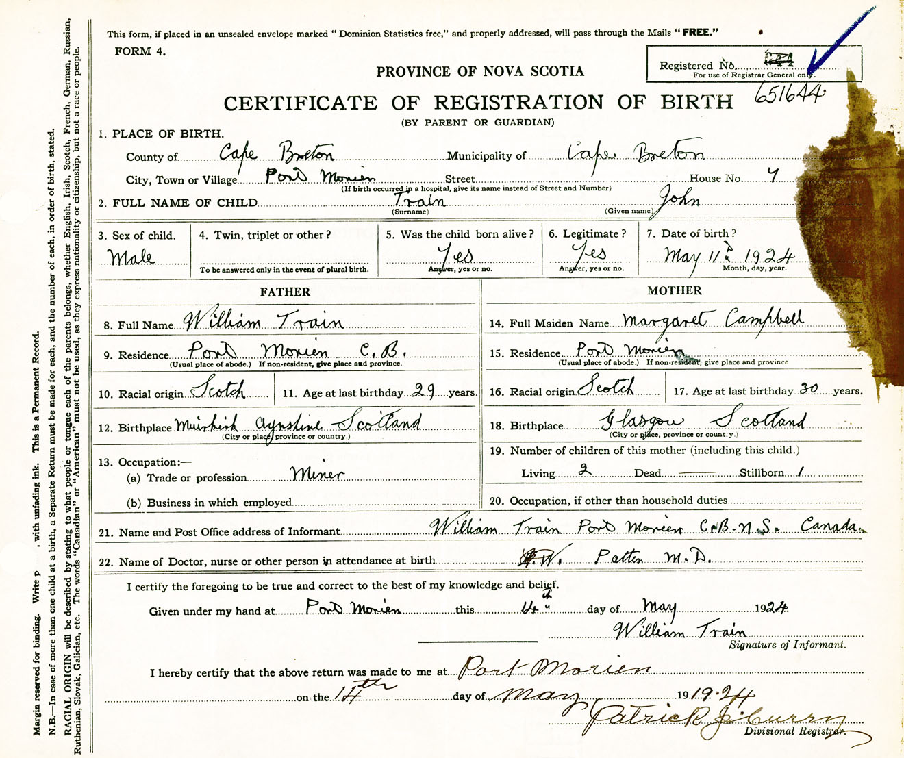 Male Birth Registration: Year: 1924 number: 65100644