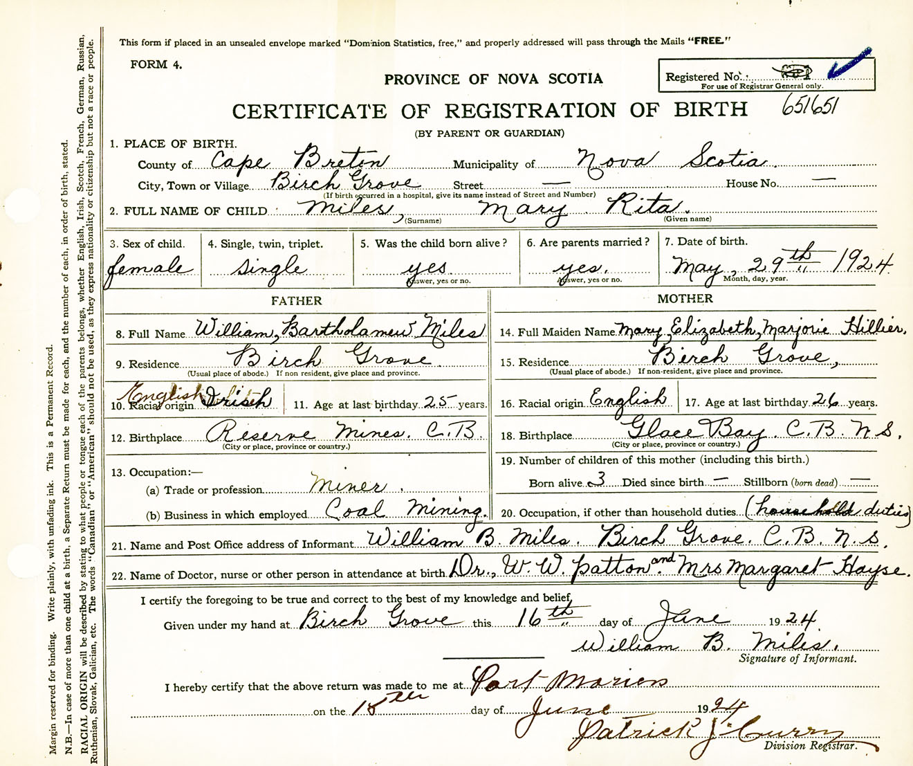 Female Birth Registration: Year: 1924 number: 65100651