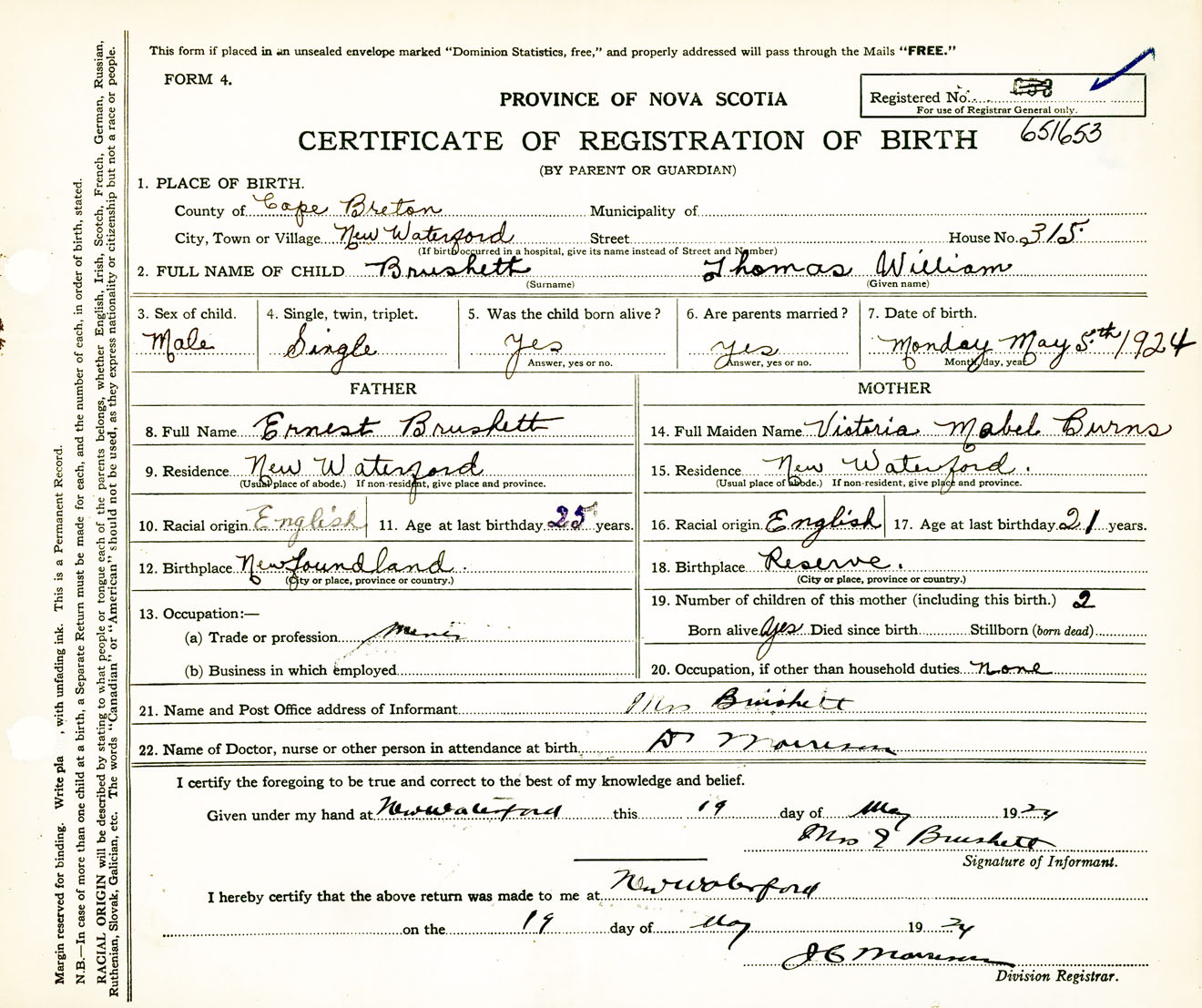 Male Birth Registration: Year: 1924 number: 65100653