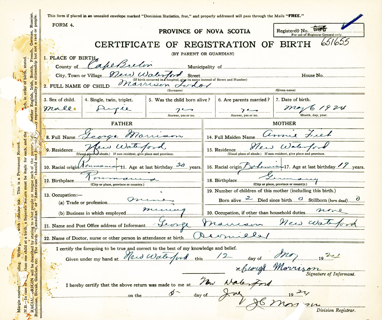 Male Birth Registration: Year: 1924 number: 65100655