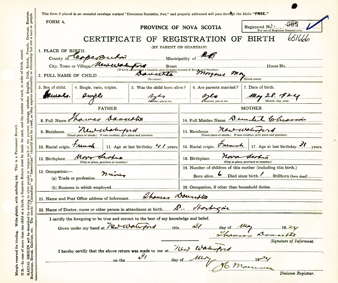 Female Birth Registration: Year: 1924 number: 65100666
