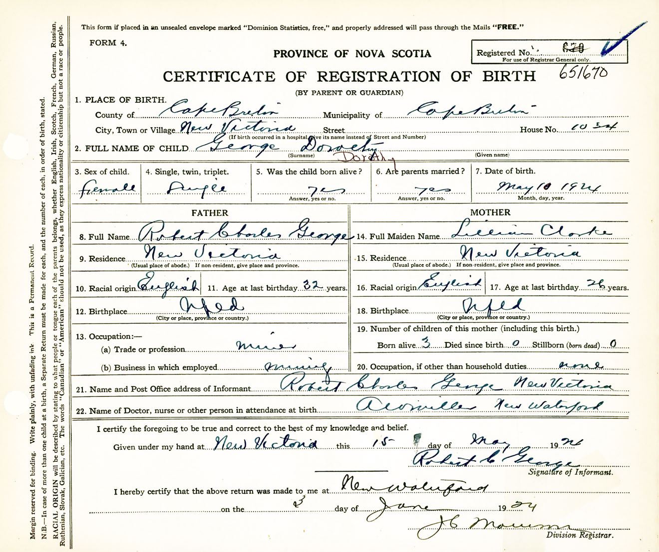 Female Birth Registration: Year: 1924 number: 65100670