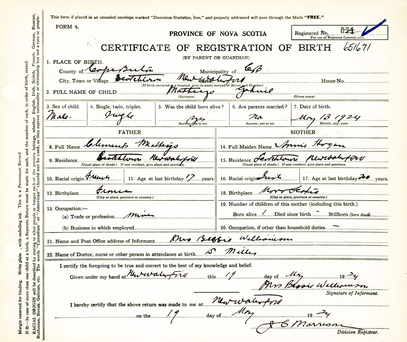 Male Birth Registration: Year: 1924 number: 65100671