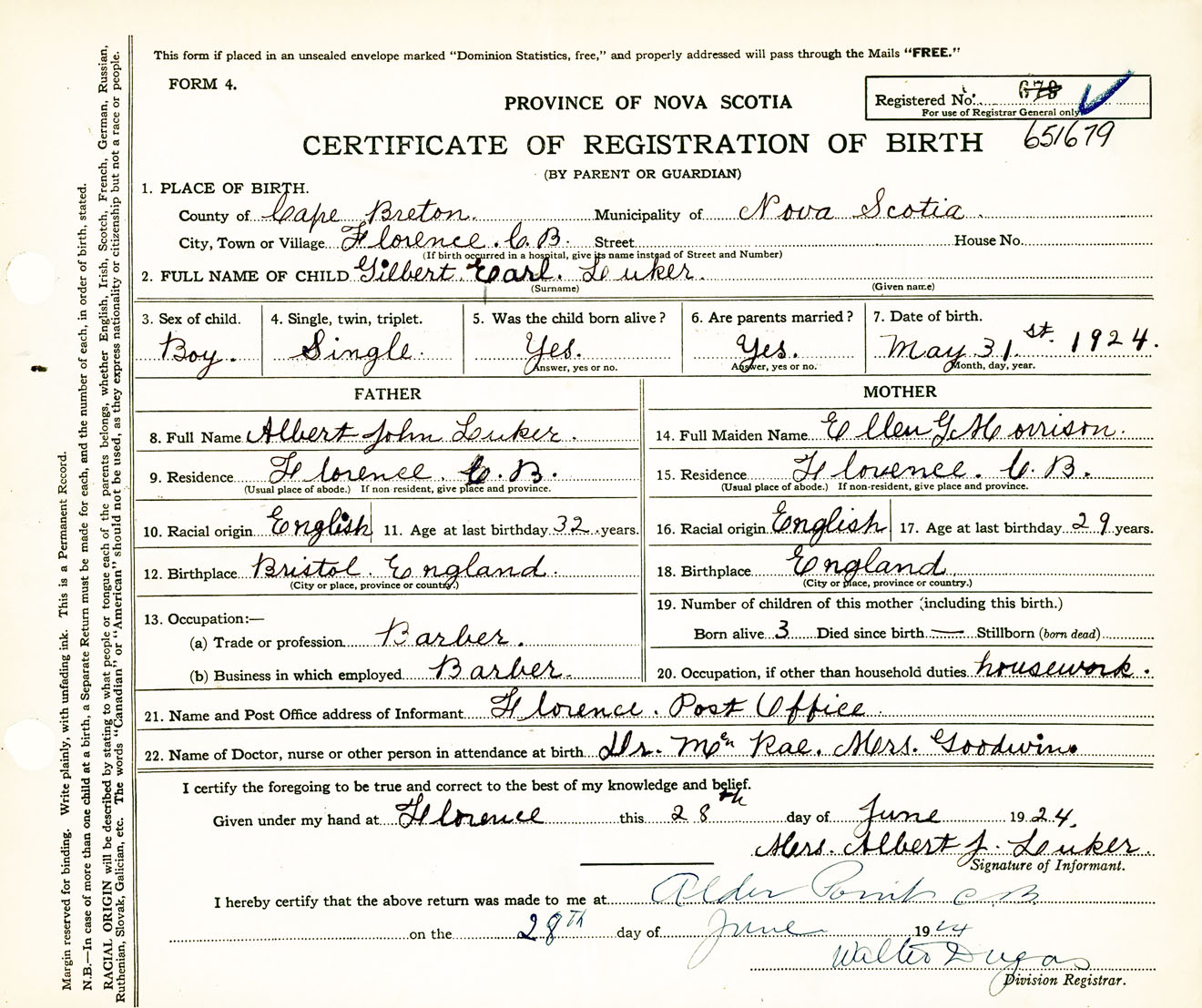 Male Birth Registration: Year: 1924 number: 65100679