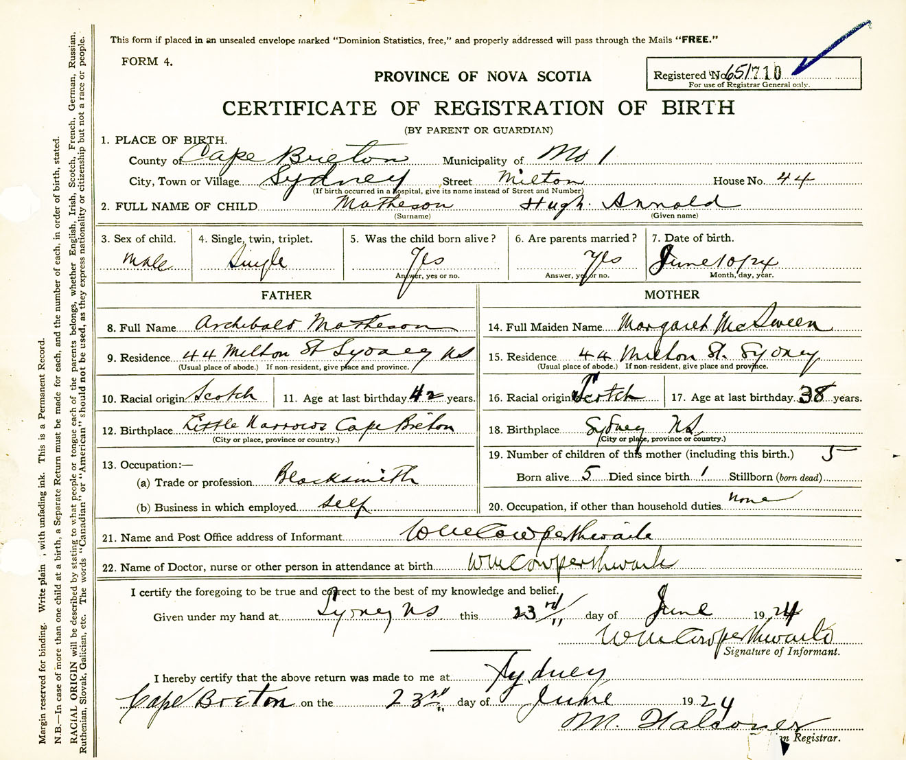 Male Birth Registration: Year: 1924 number: 65100710