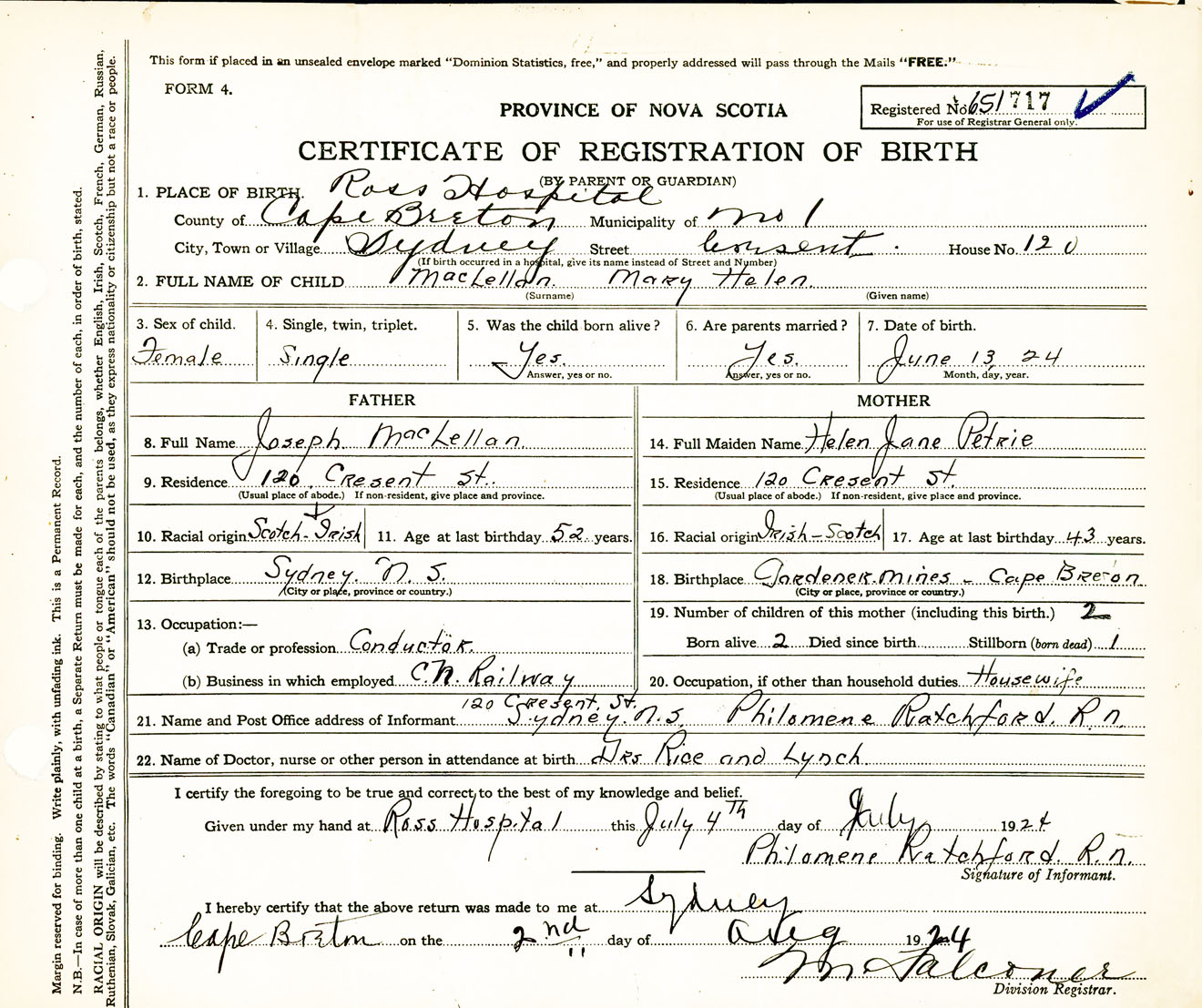 Female Birth Registration: Year: 1924 number: 65100717