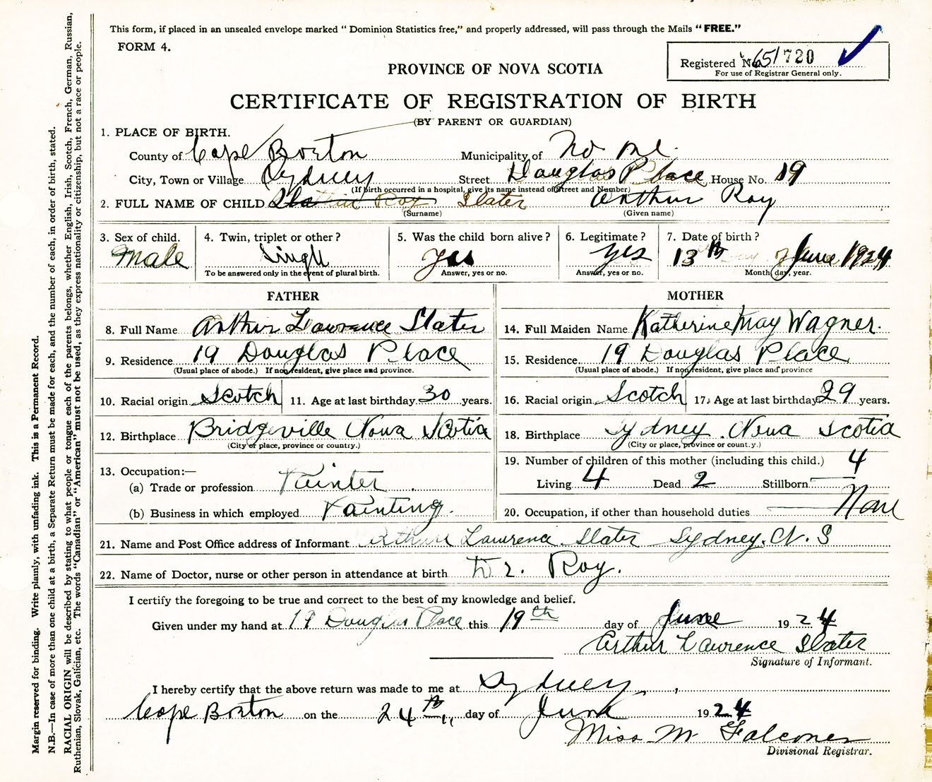 Male Birth Registration: Year: 1924 number: 65100720