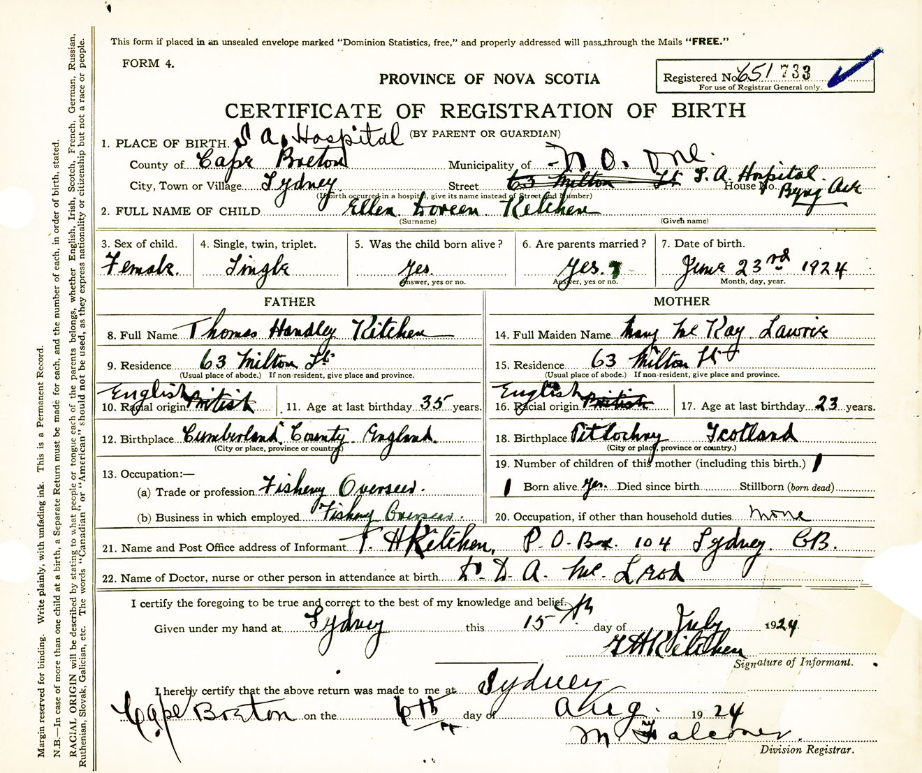 Female Birth Registration: Year: 1924 number: 65100733