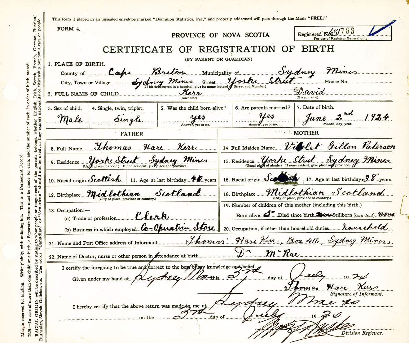Male Birth Registration: Year: 1924 number: 65100766