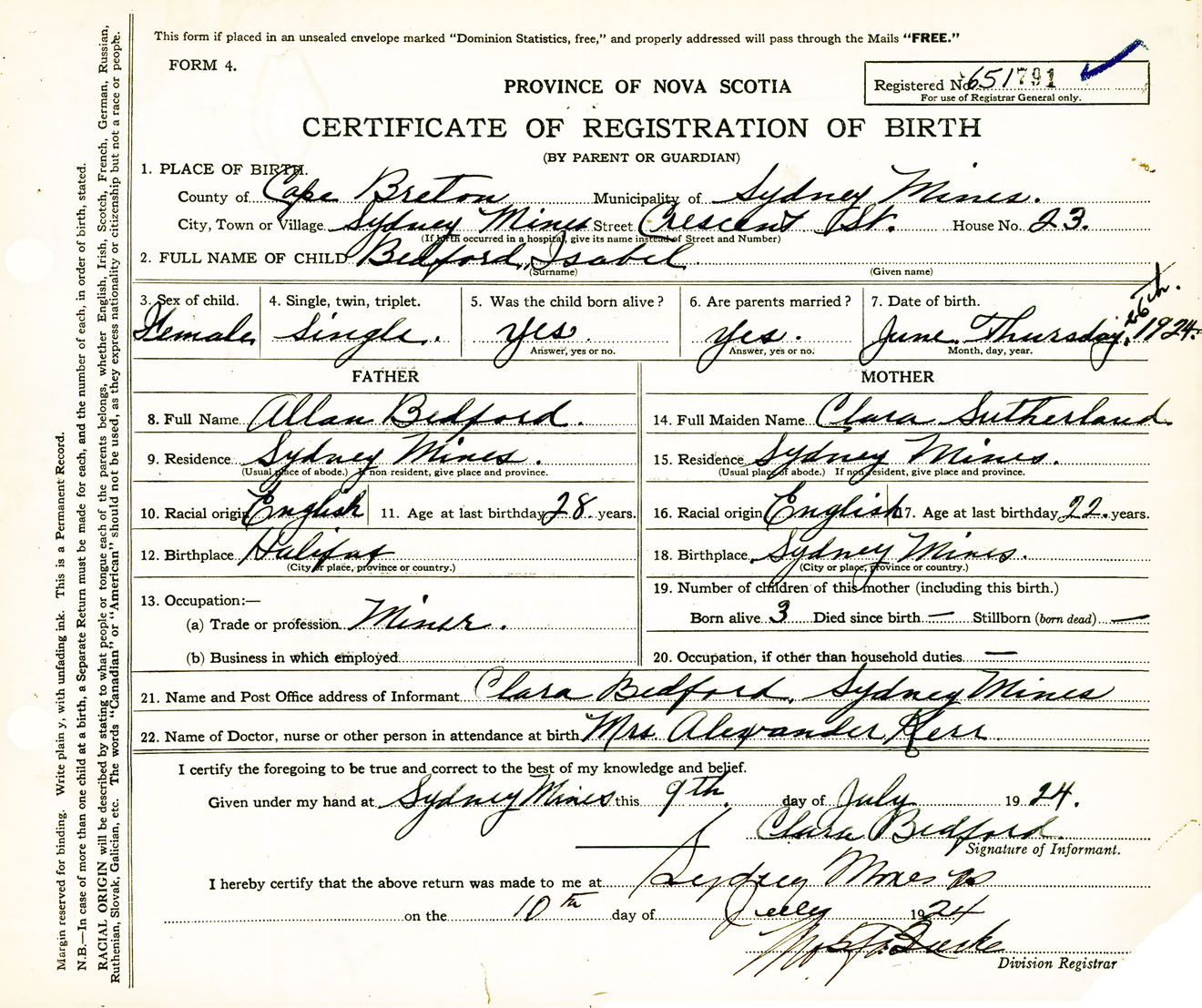 Female Birth Registration: Year: 1924 number: 65100791