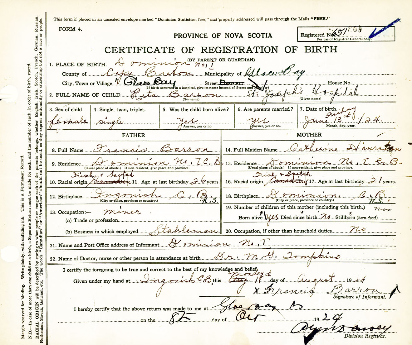 Female Birth Registration: Year: 1924 number: 65100809