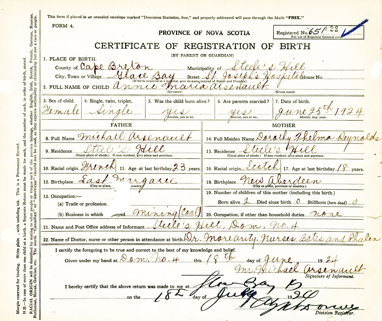 Female Birth Registration: Year: 1924 number: 65100826