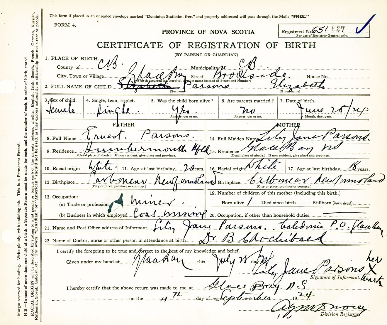 Female Birth Registration: Year: 1924 number: 65100827