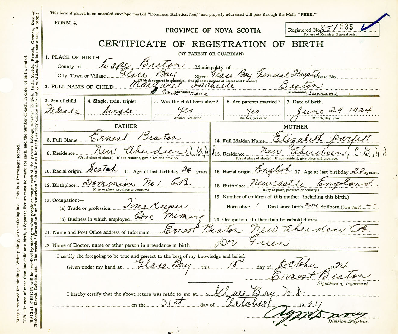 Female Birth Registration: Year: 1924 number: 65100835