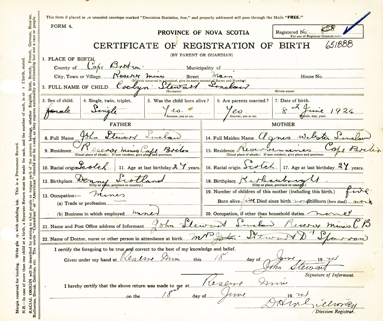 Female Birth Registration: Year: 1924 number: 65100888